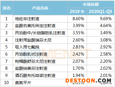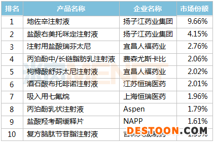 TOP10廠家中,有揚(yáng)子江藥業(yè)集團(tuán)、宜昌人福藥業(yè)、齊魯制藥、江蘇恩華藥業(yè)、江蘇恒瑞醫(yī)藥5家國內(nèi)企業(yè)。產(chǎn)品TOP10中,有8個(gè)是注射劑。品牌TOP10中,10億大品種僅有揚(yáng)子江藥業(yè)集團(tuán)的地佐辛注射液,而集采則“帶飛”鹽酸右美托咪定注射液成為第二大品牌;江蘇恒瑞醫(yī)藥的獨(dú)家產(chǎn)品酒石酸布托啡諾注射液市場份額不斷提升,躍升至第六位。