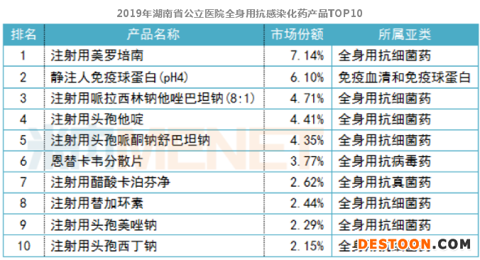 2019年湖南省公立醫(yī)院全身用抗感染化藥產(chǎn)品TOP10