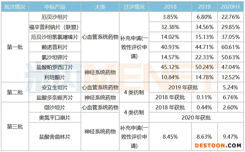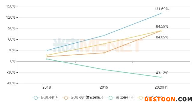 第一批國(guó)采中標(biāo)的7個(gè)產(chǎn)品全部是按一致性評(píng)價(jià)補(bǔ)充申請(qǐng)獲批過評(píng),這些產(chǎn)品進(jìn)入市場(chǎng)已有些時(shí)日,但華海藥業(yè)借助國(guó)采的契機(jī)大幅提升了市場(chǎng)覆蓋率,厄貝沙坦片、厄貝沙坦氫氯噻嗪片、賴諾普利片、氯沙坦鉀片在中國(guó)城市公立醫(yī)院、縣級(jí)公立醫(yī)院、城市社區(qū)中心及鄉(xiāng)鎮(zhèn)衛(wèi)生院(簡(jiǎn)稱中國(guó)公立醫(yī)療機(jī)構(gòu))終端的市場(chǎng)份額年年遞增,厄貝沙坦片2020上半年銷售額增速更高達(dá)131.69%;從市場(chǎng)競(jìng)爭(zhēng)的角度看,華海藥業(yè)已一躍成為厄貝沙坦氫氯噻嗪片、賴諾普利片、氯沙坦鉀片以及鹽酸帕羅西汀片的領(lǐng)軍企業(yè)。