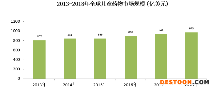 2013年~2018年全球兒童藥物市場規(guī)模呈逐年上升趨勢,近5年復(fù)合增長率(CAGR)為3.76%,2018年全球兒童藥物市場規(guī)模約為973億美元。