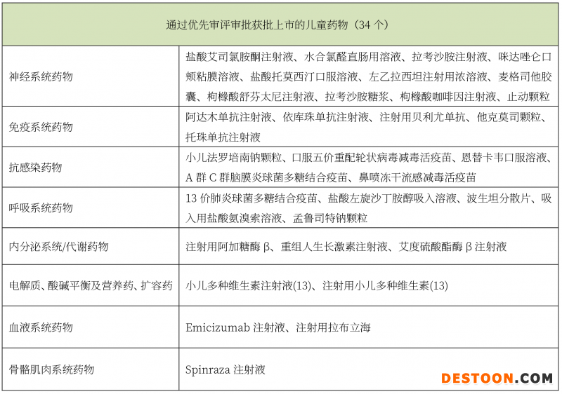 在兒童藥物優(yōu)先審評審批方面,2016-2019年國家局已陸續(xù)將989個(gè)品種納入優(yōu)先審評程序中,其中兒童藥物96件(占比為9.7%),已有80多個(gè)企業(yè)享受優(yōu)惠政策。截至目前,通過兒童用藥優(yōu)先審評審批上市的產(chǎn)品共計(jì)34個(gè),詳見下表。