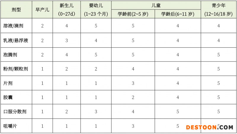 歐盟針對不同年齡段兒童進(jìn)行了劑型(口服給藥途徑)推薦: