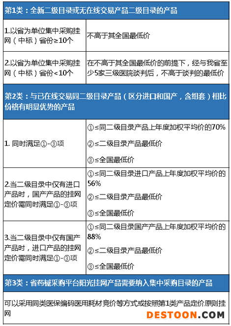 《方案》明確對于“全新二級(jí)目錄或無在線交易產(chǎn)品二級(jí)目錄的產(chǎn)品”,在以省為單位集中采購掛網(wǎng)(中標(biāo))省份達(dá)10個(gè)及以上的,不高于其全國最低價(jià);不足10個(gè)的,在不高于其全國最低價(jià)的前提下,經(jīng)與我省至少5家三級(jí)醫(yī)院談判后,不高于談判的最低價(jià)。全新二級(jí)目錄須在功能、適用范圍、結(jié)構(gòu)性能組成等方面與現(xiàn)有二級(jí)目錄有較大區(qū)別,并經(jīng)專家論證后確定。