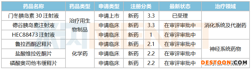 在消化系統(tǒng)及代謝藥領域,東陽光藥申報了門冬胰島素30注射液上市已獲得受理,德谷胰島素注射液以及HEC88473注射液的臨床申請正在審評審批中;在神經(jīng)系統(tǒng)藥物領域,目前市場僅有進口的鹽酸魯拉西酮片獲批,暫無其他劑型,東陽光藥為魯拉西酮遲釋片首家申報企業(yè),而鹽酸維拉佐酮片暫無進口以及國內(nèi)仿制獲批上市,但已有16家國內(nèi)藥企申報3.1類新藥臨床已獲批。