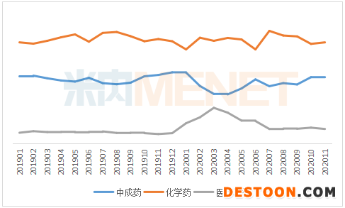 從樣本藥店每個月的份額走勢看,新冠疫情爆發(fā)期間,2020年上半年醫(yī)療器械的份額急劇攀升,在3月份達(dá)到頂峰,下半年趨于穩(wěn)定,但市場份額明顯高于2019年?;瘜W(xué)藥的份額走勢堅(jiān)挺,受新冠疫情的影響相對較弱,而以呼吸系統(tǒng)疾病用藥為首的中成藥明顯受挫,僅在疫情基本穩(wěn)定的6月份有增長小高峰。