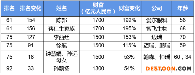 受新冠疫情影響,生物科技是過去一年增長最快的行業(yè)之一,大健康行業(yè)十億美金企業(yè)家大幅增加。位列大健康行業(yè)第一的是愛爾眼科創(chuàng)始人陳邦,榜單顯示,56歲的陳邦財富去年增長兩倍,達(dá)到1700億元人民幣。其次是智飛生物的蔣仁生家族和邁瑞的李西廷、徐航。得益于翰森和恒瑞醫(yī)藥的快速增長,孫飄揚和鐘慧娟夫婦的總財富增長超過50%,至2800億元人民幣。
