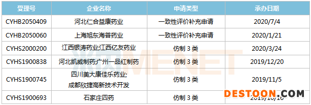 2家企業(yè)提交鹽酸溴己新注射液一致性評(píng)價(jià)補(bǔ)充申請(qǐng),目前仍在審評(píng)審批中;4家企業(yè)以仿制3類提交該產(chǎn)品上市申請(qǐng),其中成都欣捷高新技術(shù)開(kāi)發(fā)/四川美大康佳樂(lè)藥業(yè)的產(chǎn)品獲批生產(chǎn)并視同過(guò)評(píng),為國(guó)內(nèi)首家。
