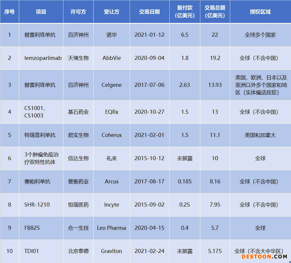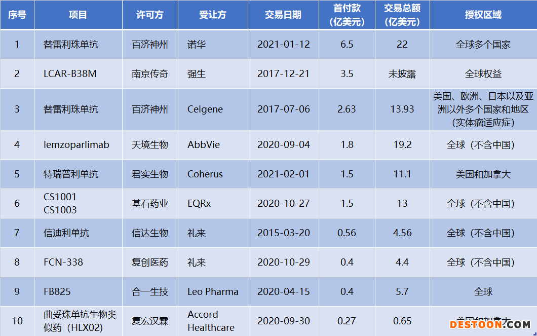 中國(guó)藥企對(duì)外項(xiàng)目許可TOP10(按交易總額)