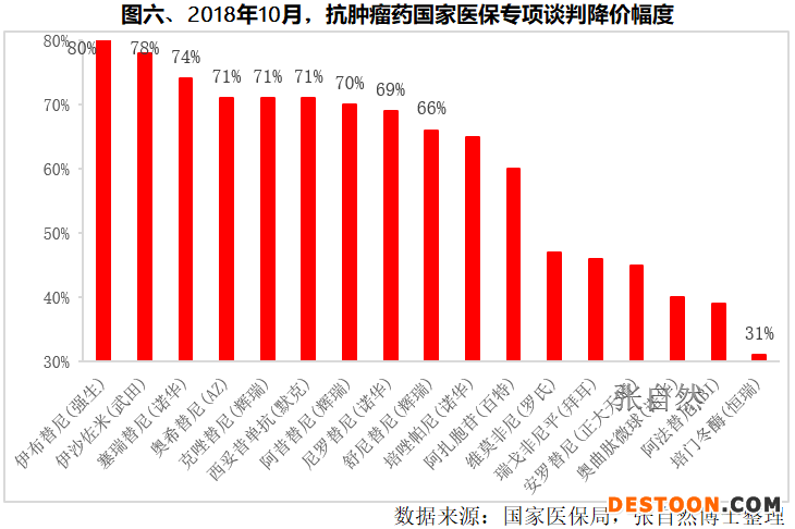 以2018年10月10日國家醫(yī)保局進(jìn)行的抗癌藥的專項談判為例,17種談判成功藥品與平均零售價相比,最高降幅80%,平均降幅達(dá)56.7%,大部分進(jìn)口抗癌藥談判后的支付標(biāo)準(zhǔn)低于周邊國家或地區(qū)市場價格,平均低36%。