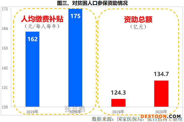 鼓勵貧困人口參加醫(yī)療保險,到2020年,貧困人口參保率提高到了99.9%以上。對特困人員參加城鄉(xiāng)居民醫(yī)保實施全額資助,對其他貧困人口實施定額資助,人均繳費補(bǔ)貼由2019年的162元/每人每年提高到了2020年的175元/每人每年,資助總額由2019年的124.3億元提高到了2020年的134.7億元(圖三),醫(yī)保扶貧政策累計資助貧困人口參保2.3億人次,已累計資助參保支出369億元。