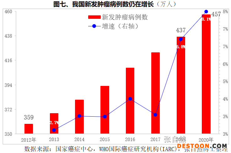 我國腫瘤發(fā)病人數(shù)還在繼續(xù)增長,已由2012年的359萬人增長到2020年的457萬人(圖七)。