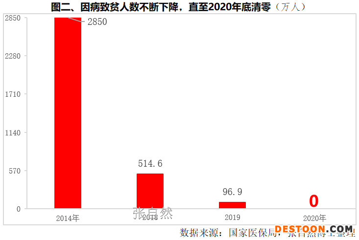 醫(yī)保在脫貧中發(fā)揮了重要作用,疾病已成為所有致貧因素之首,因病致貧人數(shù)由2014年的2850萬人下降到了2019年的96.9萬人,直至2020年底清零。