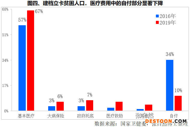 因醫(yī)保制度安排,建檔立卡貧困人口醫(yī)療費用中的自費部分占比,已由2016年的34%下降到了2019年的10%,大幅減輕了貧困人口的醫(yī)療負(fù)擔(dān)。(圖四)