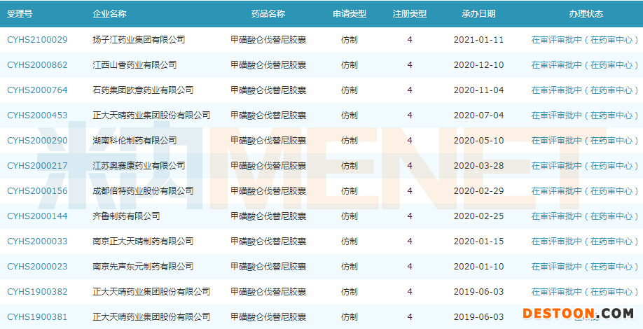 目前國內市場共有10家企業(yè)提交甲磺酸侖伐替尼膠囊仿制4類上市申請,涉及正大天晴、先聲藥業(yè)、齊魯制藥、科倫藥業(yè)、石藥集團、揚子江藥業(yè)及奧賽康等。正大天晴藥業(yè)集團的甲磺酸侖伐替尼膠囊注冊辦理狀態(tài)已變更為“在審批”,有望奪下首仿。