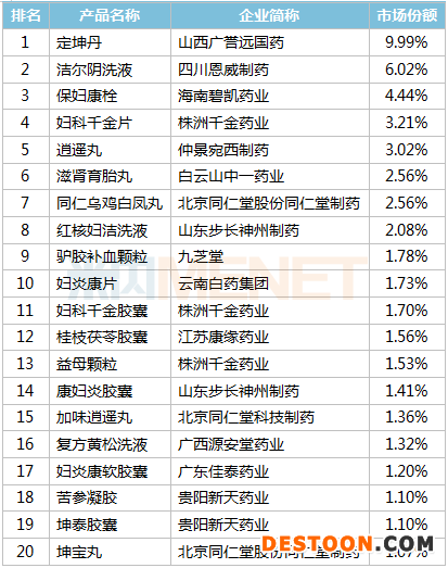 品牌TOP20中,山西廣譽(yù)遠(yuǎn)國藥的定坤丹、四川恩威制藥的潔爾陰洗液、海南碧凱藥業(yè)的保婦康栓位居前三,株洲千金藥業(yè)的婦科千金片、婦科千金膠囊、益母顆粒躋身品牌TOP20。