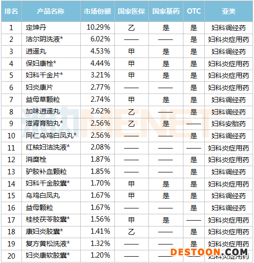 2020E重點(diǎn)城市實(shí)體藥店婦科中成藥產(chǎn)品TOP20