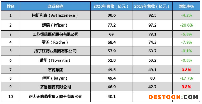 根據(jù)2020年的最新數(shù)據(jù),樣本醫(yī)院銷售額排名前10的藥企有:阿斯利康、輝瑞、江蘇恒瑞、羅氏、揚子江藥業(yè)、諾華、石藥集團、拜耳、齊魯制藥、正大天晴藥業(yè)集團。