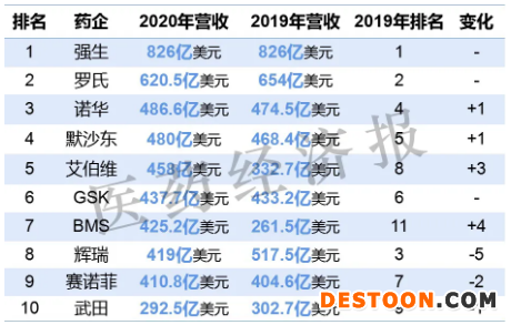 其中,完成剝離仿制藥業(yè)務(wù)普強(Upjohn)交易的輝瑞(Pfizer)下滑5個名次,降至第8名;而得益于收購艾爾建(Allergan),艾伯維(AbbVie)上升3個名次,成功躋身前5名;同樣由于收購新基(Celgene),百時美施貴寶(BMS)爬升4個名次,順利進入十強藥企的梯隊;在多起重塑行業(yè)競爭格局的超級并購影響下,2019年原本排在末位的拜耳此番跌出十強。