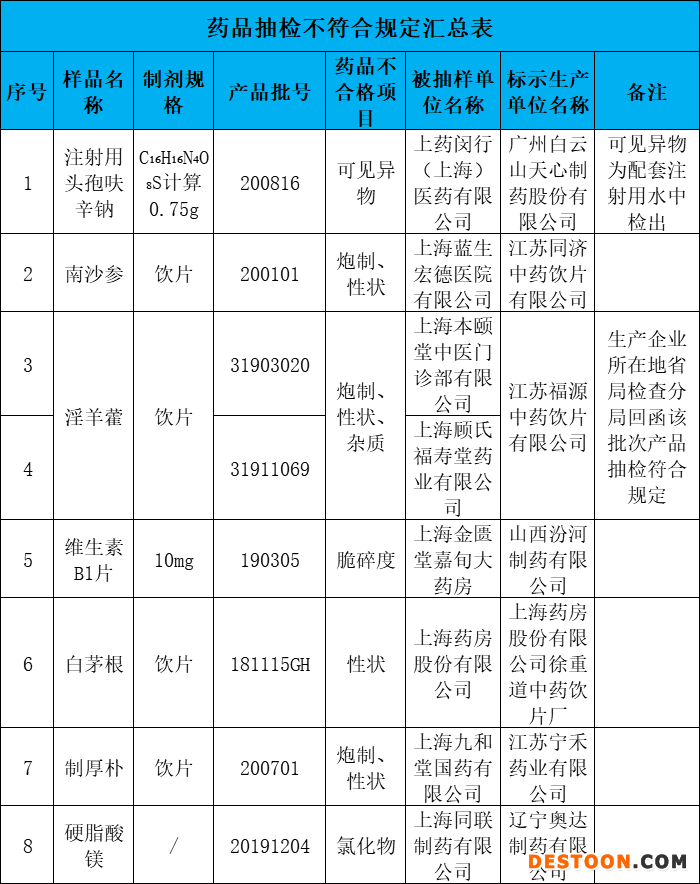 根據(jù)通告,有7個(gè)藥品不符合規(guī)定,分別為注射用頭孢呋辛鈉、南沙參、淫羊藿、維生素B1片、白茅根、制厚樸、硬脂酸鎂。