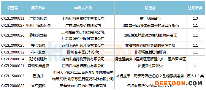 此外,9款中成藥獲得臨床試驗(yàn)?zāi)驹S可,包括康緣藥業(yè)的靜脈炎顆粒、百神昌諾藥業(yè)的宮頸炎康凝膠、中嘉藥物的延芍利膽片、玉森新藥的安心顆粒等。
