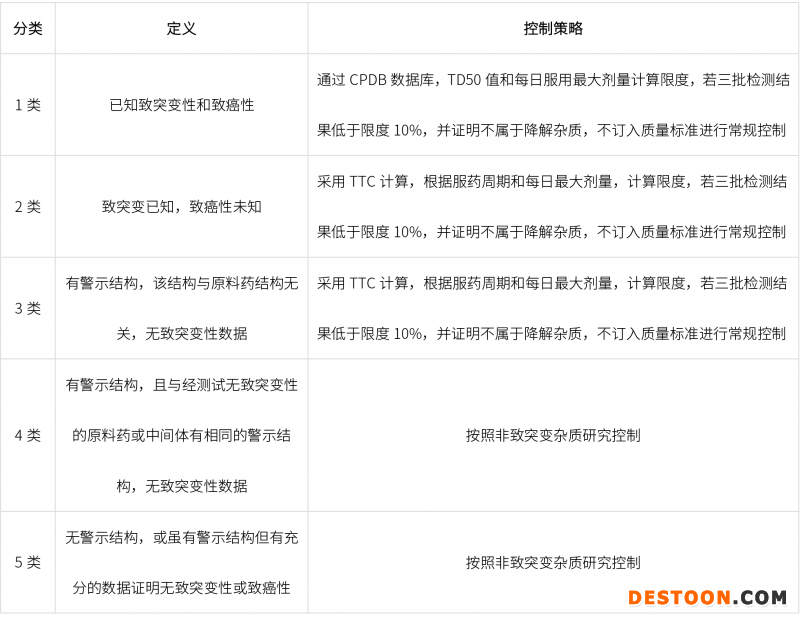 根據(jù)生產(chǎn)工藝和警示結(jié)構(gòu),確定產(chǎn)生致突變雜質(zhì),并依據(jù)ICH M7進(jìn)行如下分類,確定相應(yīng)的控制限度。