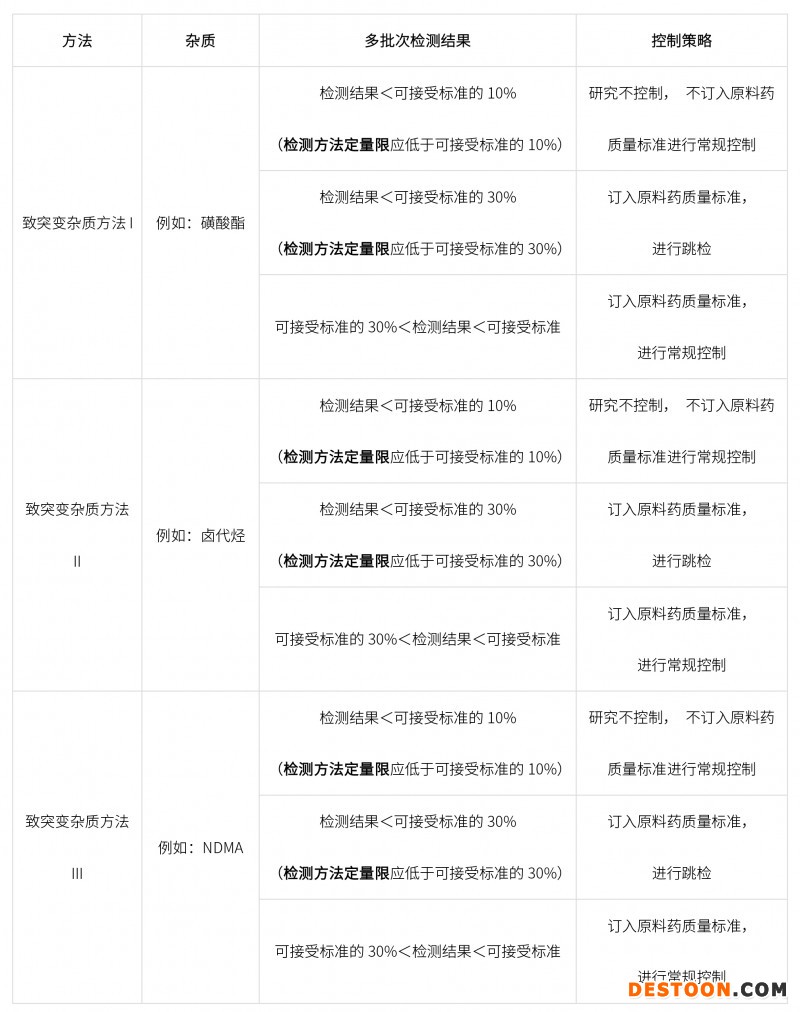 開發(fā)致突變雜質(zhì)相關(guān)方法檢測(cè)原料藥中致突變雜質(zhì),雜質(zhì)控制策略如下: