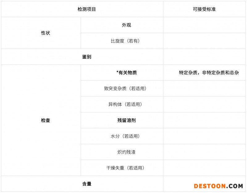 API質(zhì)量標(biāo)準(zhǔn),應(yīng)參照所有相關(guān)藥典,檢測(cè)項(xiàng)目覆蓋所有藥典,檢測(cè)限度選取藥典最嚴(yán)格的限度制定,如下: