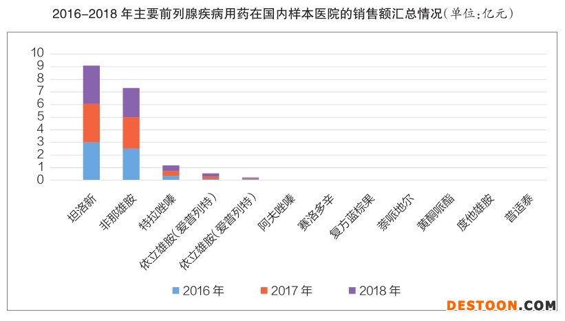 α-受體阻滯劑主要是通過抑制前列腺平滑肌中的α1受體,引起平滑肌舒張、松弛,從而減輕前列腺組織對于尿道的壓力,減輕尿道梗阻。α-受體阻滯劑適用于異常排尿癥狀,輕、中度患者及未導致嚴重排尿障礙者。最常用的α-受體阻滯劑是坦洛新,2019年該藥在全國主要樣本醫(yī)院的銷售額超過3.2億元。