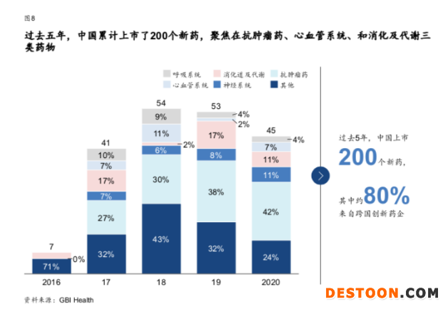 在已經(jīng)上市的200個創(chuàng)新藥品種中,跨國藥企占到了156個,高達(dá)80%;但是隨著時間的推移,創(chuàng)新藥的多元性有所提升——2010-2015年間 ,抗腫瘤藥占比高達(dá)47 %,而到了2016-2020年,神經(jīng)系統(tǒng)、消化道及代謝藥物、心血管和呼吸系統(tǒng)的藥物數(shù)量逐漸增加,抗腫瘤藥物占比下降至33%。