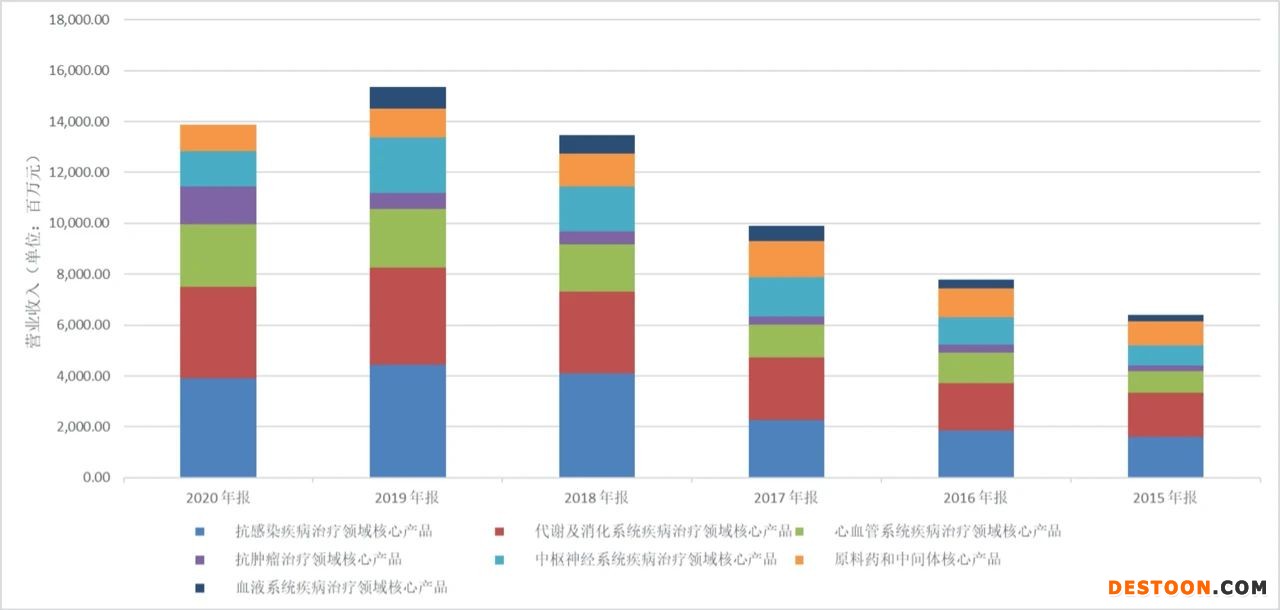 縱觀2020年,復(fù)星醫(yī)藥對其產(chǎn)品線做出了重大調(diào)整。2020年復(fù)星醫(yī)藥將全部血液系統(tǒng)疾病治療領(lǐng)域的核心產(chǎn)品摘除,雖然該產(chǎn)品線的營業(yè)收入貢獻(xiàn)僅位于所有產(chǎn)品線收入的倒數(shù)第二位,但砍掉這條產(chǎn)品線直接導(dǎo)致減少了8個億左右的營業(yè)收入。同時,其他的產(chǎn)品線比如中樞神經(jīng)系統(tǒng)、抗感染疾病治療等產(chǎn)品,營業(yè)收入相比去年分別下降了8.07億、5.03億。其余的產(chǎn)品線比如代謝及消化系統(tǒng)領(lǐng)域核心產(chǎn)品、原材料和中間體核心產(chǎn)品的營業(yè)收入均不及去年同期。在種種不利情況下,復(fù)星醫(yī)藥的抗腫瘤領(lǐng)域的核心產(chǎn)品營收則異軍突起,挑起了增長的大梁。從2019年6.2億的營業(yè)收入增加到2020年的14.78億,在主營業(yè)務(wù)收入構(gòu)成中從最后一位提高到第4位,完成了質(zhì)的飛躍,見圖1。但是這種產(chǎn)品線的調(diào)整對于復(fù)星醫(yī)藥業(yè)績的影響并不是決定性的,這也與公司一脈相承的發(fā)展思路有關(guān)。