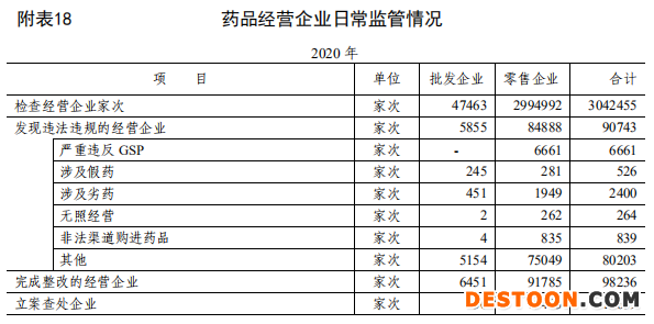 其中, 檢查批發(fā)企業(yè) 4.75 萬家次,發(fā)現(xiàn)存在違反藥品經(jīng)營相關(guān)管理規(guī)定行為的企業(yè) 5855 家次,完成整改 6451 家次。檢查零售企業(yè)299.5萬家次,發(fā)現(xiàn)存在違反藥品經(jīng)營相關(guān)管理規(guī)定行為的企業(yè) 8.49 萬家次,完成整改9.18萬家次。