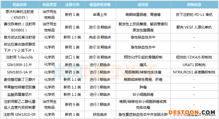 與康寧杰瑞和思路迪三方合作開發(fā)的恩沃利單抗注射液(KN035)已申報上市,屬于競爭相對少的皮下注射PD-L1;正在開展III期臨床的注射用Trilaciclib是一款短效的CDK4/6抑制劑,治療非CDK4/6依賴性腫瘤,改善患者的預后;SIM1803-1A片是國內首款進入I期臨床的NTRK/ROS1多靶點抑制劑。