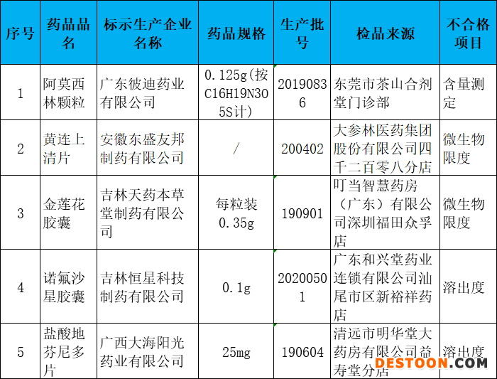 值得注意的是,在第1期通告中,有5個(gè)藥品抽檢不合格,全是常用制劑,分別為阿莫西林顆粒、黃連上清片、金蓮花膠囊、諾氟沙星膠囊、鹽酸地芬尼多片。主要不符合規(guī)定項(xiàng)目有微生物限度、溶出度、含膏量及含量測(cè)定等。