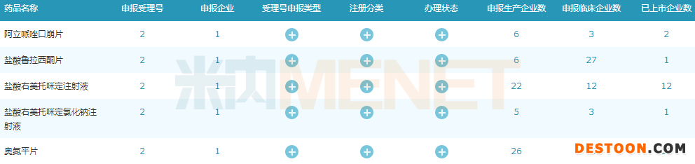 米內(nèi)網(wǎng)數(shù)據(jù)顯示,目前揚子江以新注冊分類提交5款精神安定藥上市申請,其中鹽酸右美托咪定注射液已順利獲批生產(chǎn)并視同過評,奧氮平片有望成為公司第2款獲批上市的精神安定藥。