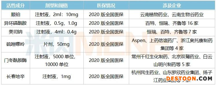 米內(nèi)網(wǎng)數(shù)據(jù)顯示,上述6個抗腫瘤藥均為2020版全國醫(yī)保目錄品種,恒瑞、齊魯、雙鷺?biāo)帢I(yè)、白云山、揚(yáng)子江等國內(nèi)巨頭均有布局。