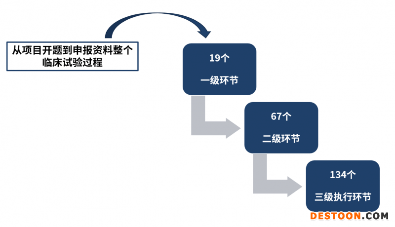 臨床試驗,從開題、合作方篩選、倫理審查、啟動入組等至最后提交注冊申報資料,共分為: 19個一級環(huán)節(jié); 包含67個二級環(huán)節(jié); 各基于風(fēng)險控制角度,共有134個三級執(zhí)行環(huán)節(jié)。