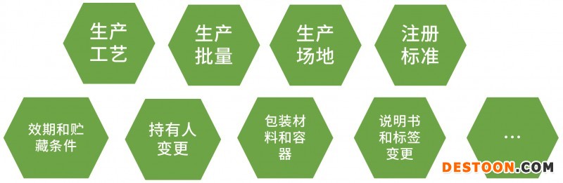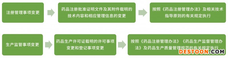 藥品上市后變更包括注冊(cè)管理事項(xiàng)變更和生產(chǎn)監(jiān)管事項(xiàng)變更,也就是涉及注冊(cè)批件和生產(chǎn)許可證相關(guān)事項(xiàng)的變更。依據(jù)變更對(duì)藥品安全性、有效性和質(zhì)量可控性的風(fēng)險(xiǎn)和產(chǎn)生影響的程度,將變更劃分為審評(píng)類變更,備案類變更和報(bào)告類變更。