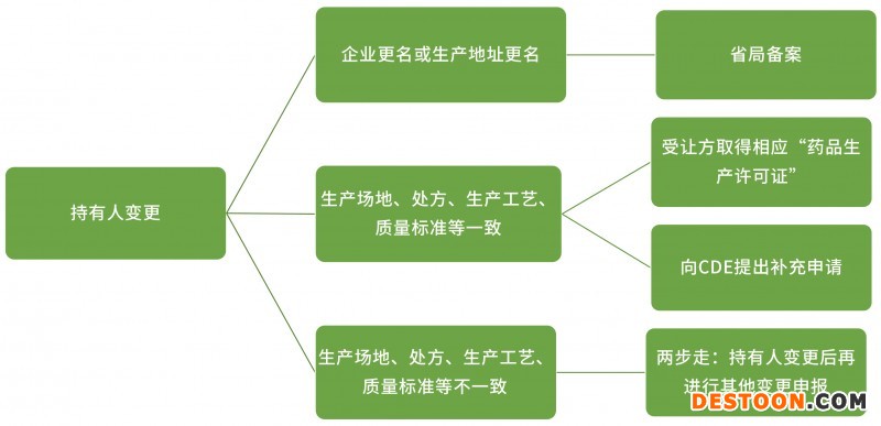 除以上變更外,《藥品上市后變更管理辦法(試行)》及《已上市化學(xué)藥品藥學(xué)變更研究技術(shù)指導(dǎo)原則(試行)》對(duì)持有人及生產(chǎn)場(chǎng)地的變更流程及研究?jī)?nèi)容進(jìn)行了明確的規(guī)定。