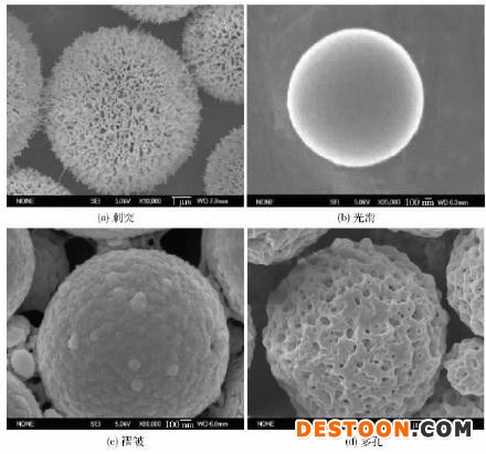 SEM是目前觀察微球形態(tài)使用最廣泛的方法,被用于表面及切面形態(tài)的觀察(見圖2)。TEM 分辨率高,圖像為二級結(jié)構(gòu)平面,適用于亞微球、納米球粒徑測定。此外還有原子力學(xué)顯微鏡(atomic force microscopy,AFM)可用于觀察微球形態(tài),AFM 優(yōu)點之一是分辨率高,與 SEM 相比,不需要對樣品進(jìn)行金屬噴鍍,避免了噴鍍后對樣品的表面形態(tài)造成的破壞,并且AFM 允許在液態(tài)環(huán)境下觀測樣品,而 SEM 則不行。但是 AFM 缺點是觀察范圍窄,得到數(shù)據(jù)不具有統(tǒng)計性,適合單個粒子表面形態(tài)的觀察。