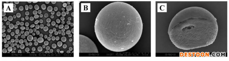 (A)全視圖 (B)單個微球表面圖 (C)單個微球切面圖