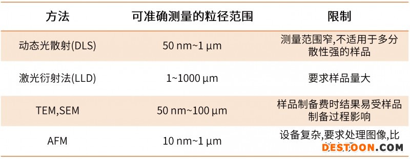 粒徑及粒徑分布是影響微球制劑釋放行為的關(guān)鍵因素,其對緩釋微球的包封率、釋放行為模式、降解速率都有一定影響,因此粒徑大小及分布是質(zhì)量控制中一個很重要的指標(biāo)。隨著檢測手段的進(jìn)步,粒徑大小及其分布測定由傳統(tǒng)的光學(xué)顯微鏡視野測定發(fā)展到電子顯微鏡的逐一統(tǒng)計再發(fā)展到近年來應(yīng)用廣泛的激光粒度儀繪制粒徑大小分布圖,可以在制備過程中的每一步工藝?yán)飳α酱笮〖胺植歼M(jìn)行追蹤檢測進(jìn)而得到目標(biāo)微球,表1介紹了各種方法的特點。
