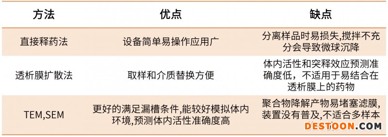 ③ 透析膜擴(kuò)散法,該法是指將微球放入透析管中,并將其放入介質(zhì)中測定。3種方法優(yōu)缺點比較見表2。