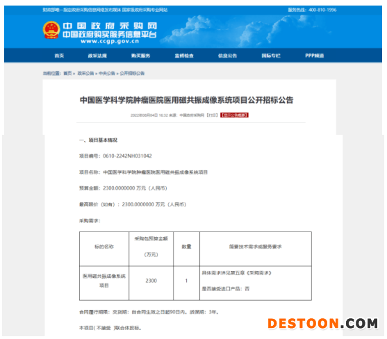中國政府采購網(wǎng)日前發(fā)布《中國醫(yī)學(xué)科學(xué)院腫瘤醫(yī)院醫(yī)用磁共振成像系統(tǒng)項目公開招標(biāo)公告》(下稱《公告》),中國醫(yī)學(xué)科學(xué)院腫瘤醫(yī)院準(zhǔn)備以2300萬采購醫(yī)用磁共振成像系統(tǒng),并明確表示“不接受進(jìn)口產(chǎn)品”。