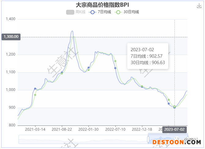 另據(jù)生意社大宗商品價(jià)格指數(shù)BPI顯示,自2023/7/2后,7日均線上穿30日均線啟動上行態(tài)勢,當(dāng)前兩條均線繼續(xù)同向上行,表明BPI進(jìn)入上行通道,同樣反映宏觀經(jīng)濟(jì)將上行。